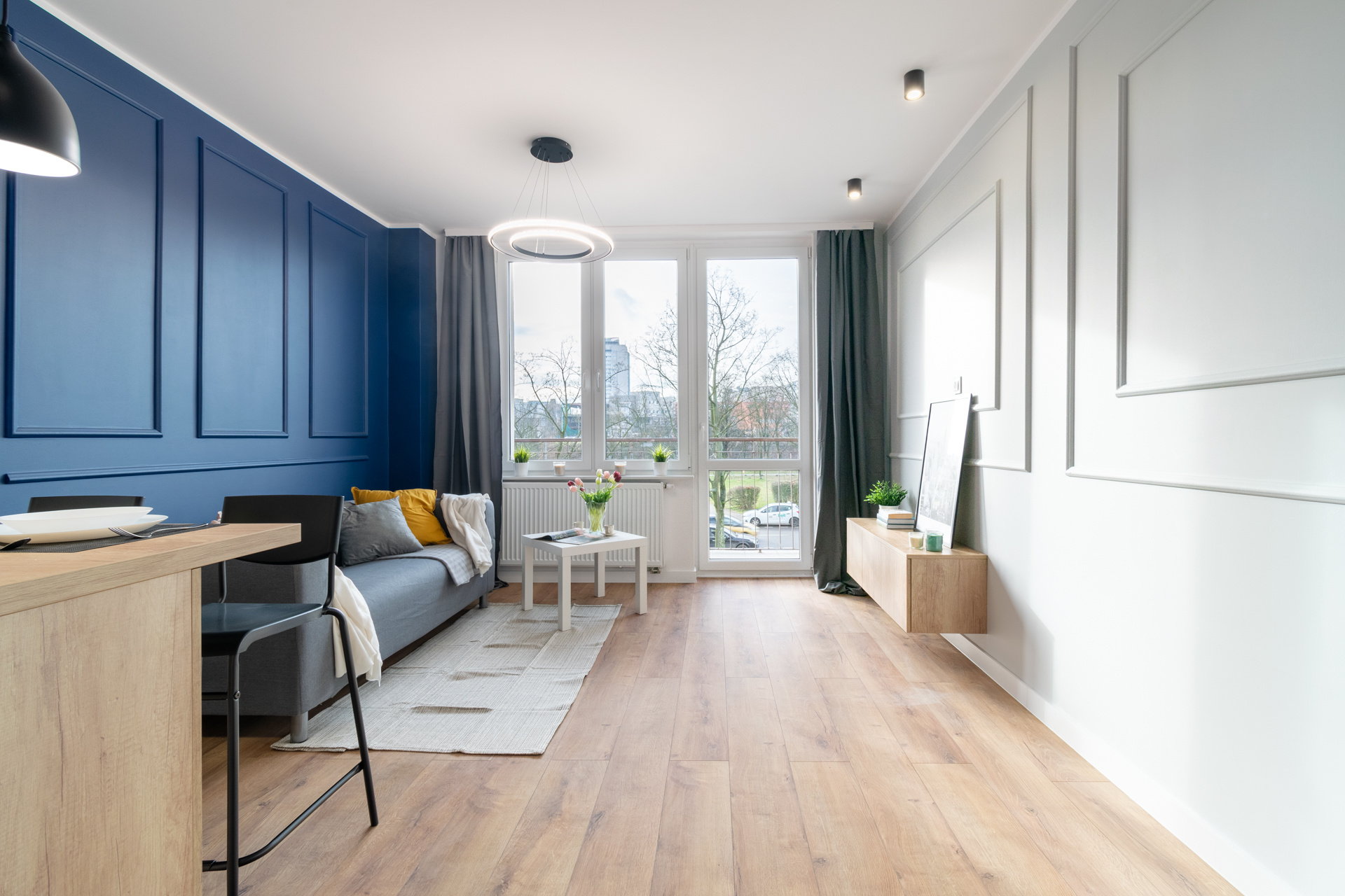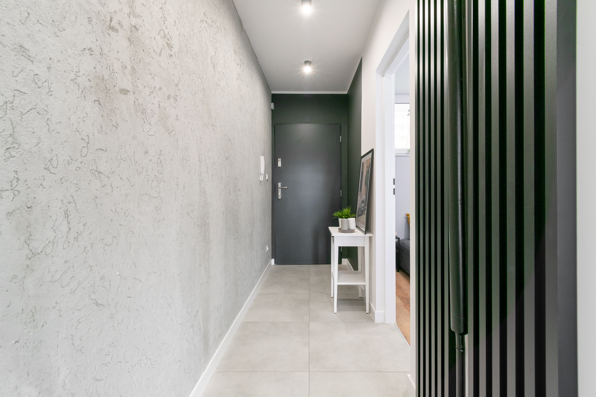 - położenie paneli w pokojach i salonie oraz płytek w przedpokoju,